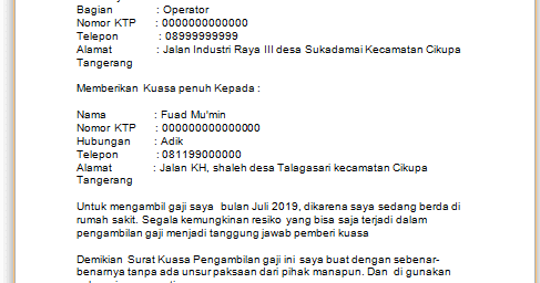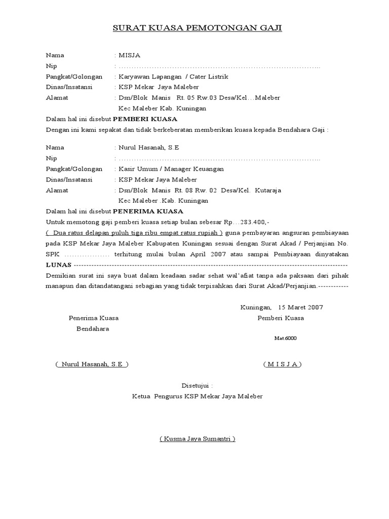 Contoh Surat Kuasa Pengambilan Gaji Karyawan - BlogGadoGado from 1.bp.blogspot.com Hal itu sebagai bukti otentik untuk mengakhiri kerjasama antara perusahaan dengan karyawan tersebut. memohon cuti tanpa gaji. Surat permohonan sendiri dapat bersifat resmi atau pun tidak resmi. Surat yang resmi biasanya ditujukan kepada suatu instansi. Surat ini bisa digunakan sebagai keterangan yang bisa digunakan untuk mengajukan pinjaman atau kredit kepada bank atau instansi. Namun bukan hanya itu, anda juga bisa mengajukan surat perincian gaji orang tua dari bendahara gaji (swasta/pns) atau surat keterangan penghasilan. Surat kuasa pengambilan gaji suatu waktu pasti akan dibutuhkan. Demikian surta permohonan penangguhan penahanan ini kami sampaikan.
